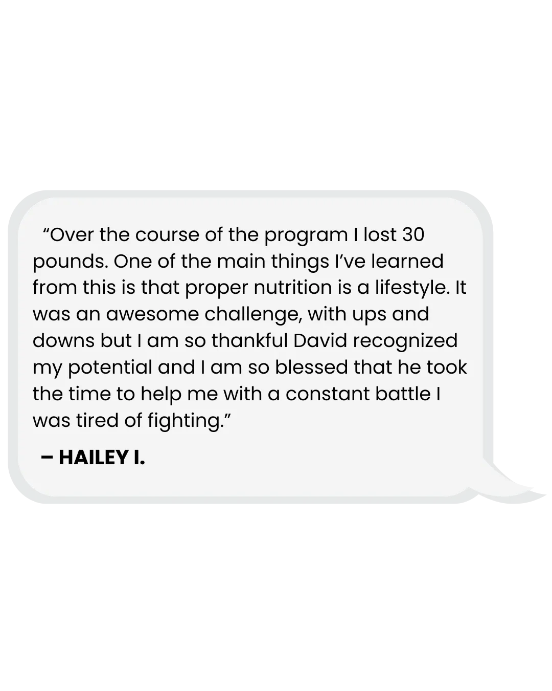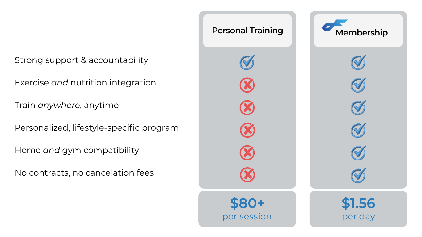 For less than a typical weekly restaurant meal, you receive custom workouts, customized nutrition guidance, accountability, and professional support designed to help you transform your mind and body!