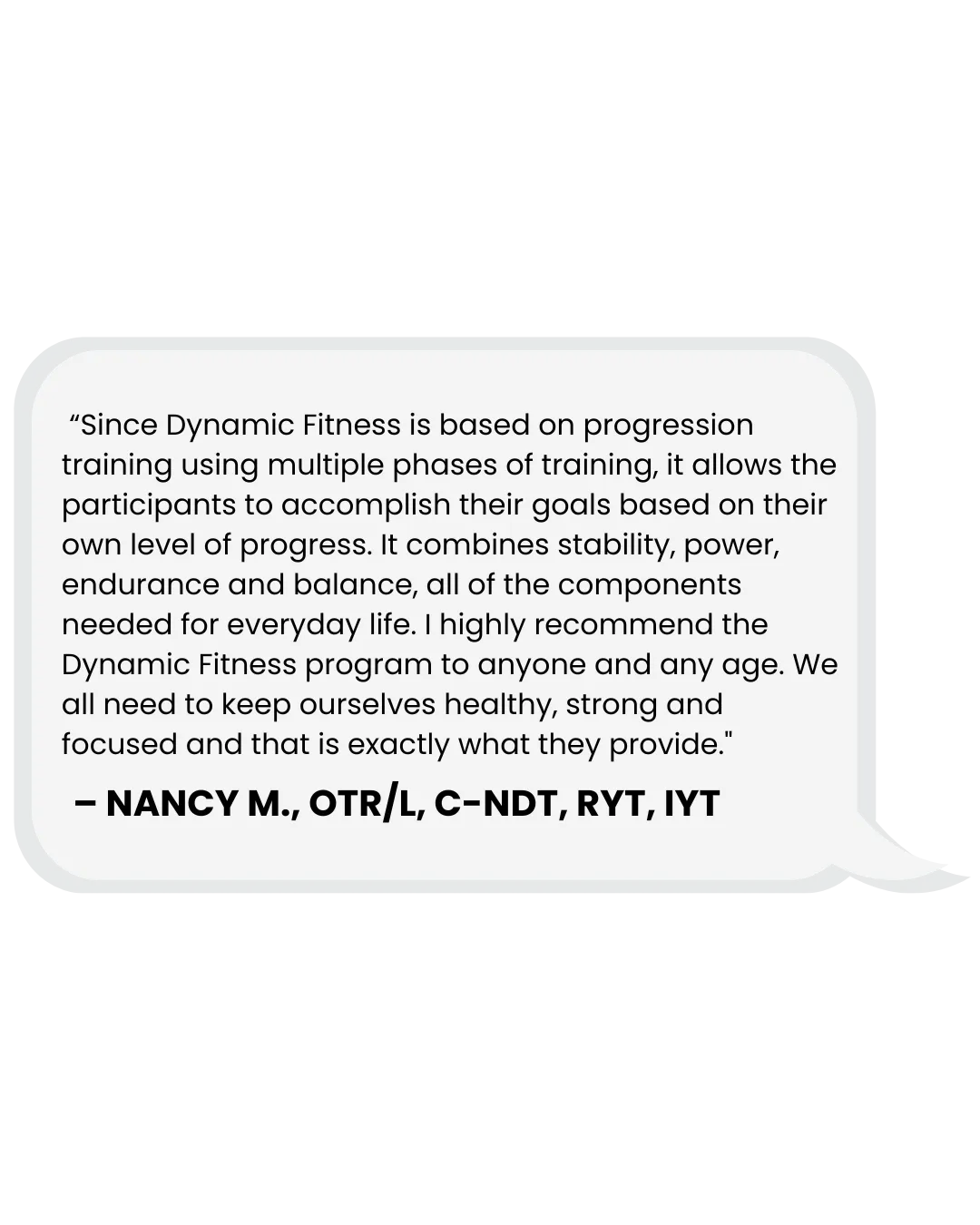 Please consult your physician regarding your personal medical situation. The Dynamic Fitness program can be modified for most conditions, and we encourage you to follow your doctor’s recommendations while adapting the plan as needed.